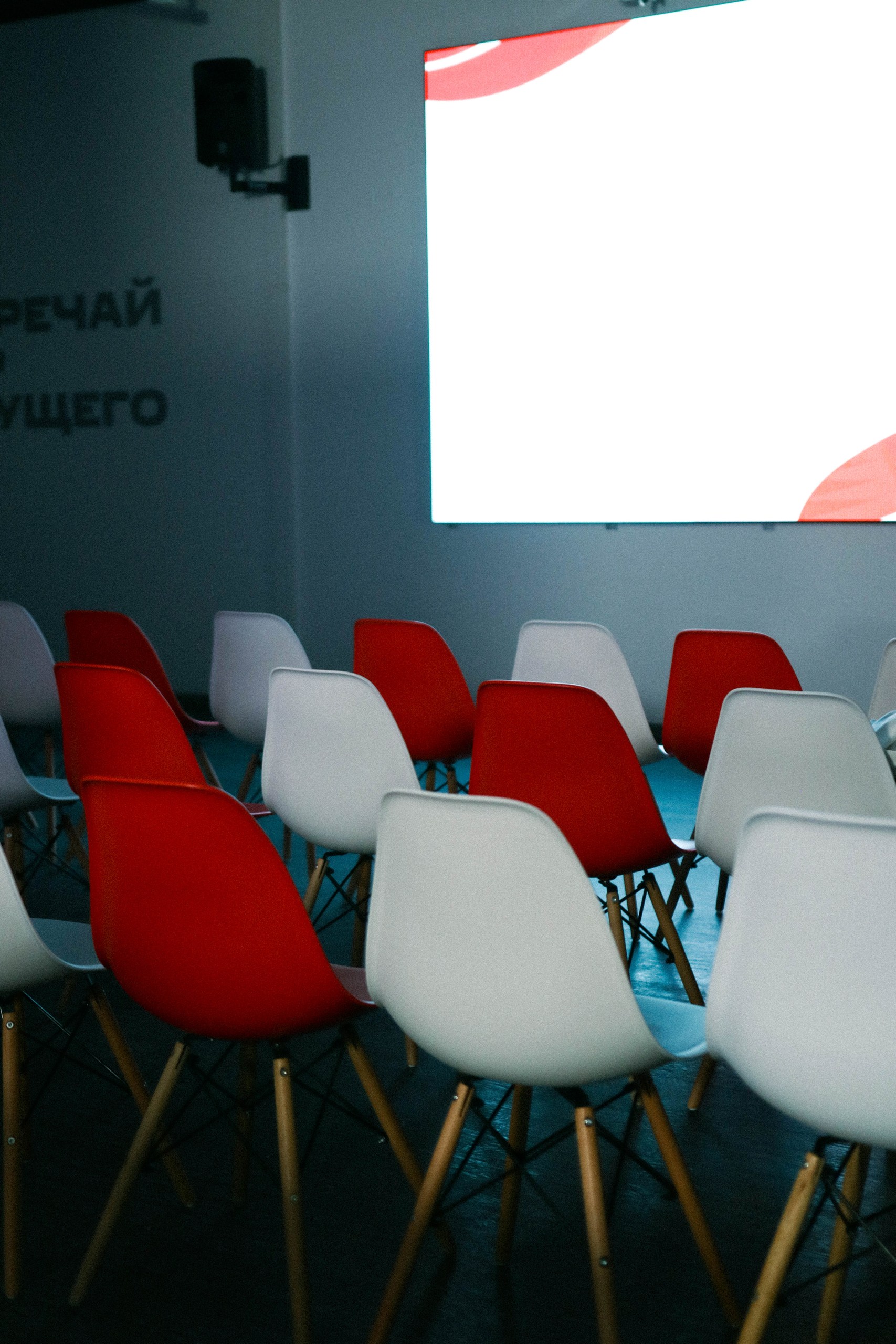 Для обучающих мероприятий важна зона без барьеров. Участник должен видеть спикера, экран и свои записи одновременно.